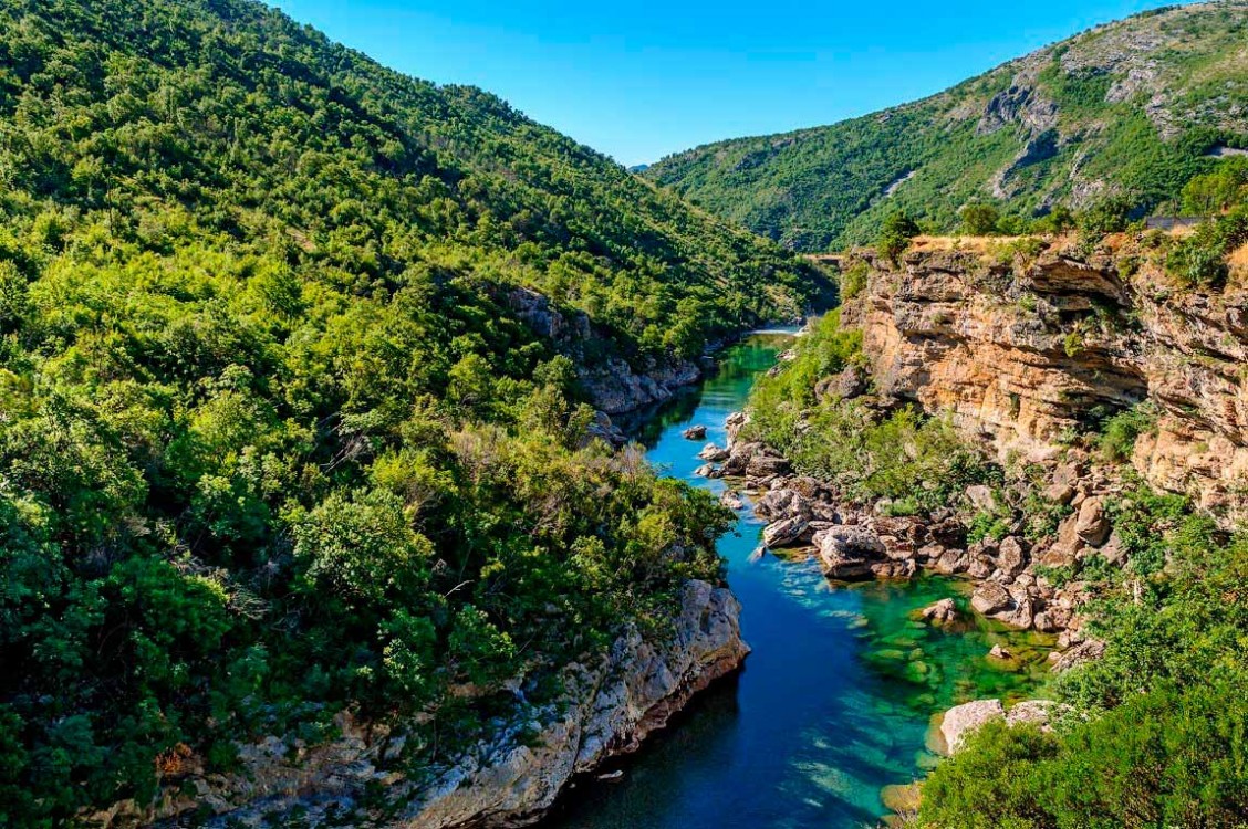 Двигаясь вдоль каньона, на протяжении длительного пути с одной стороны любуемся изумрудными водами бурлящего потока реки Морача, а с другой — величественными горами.